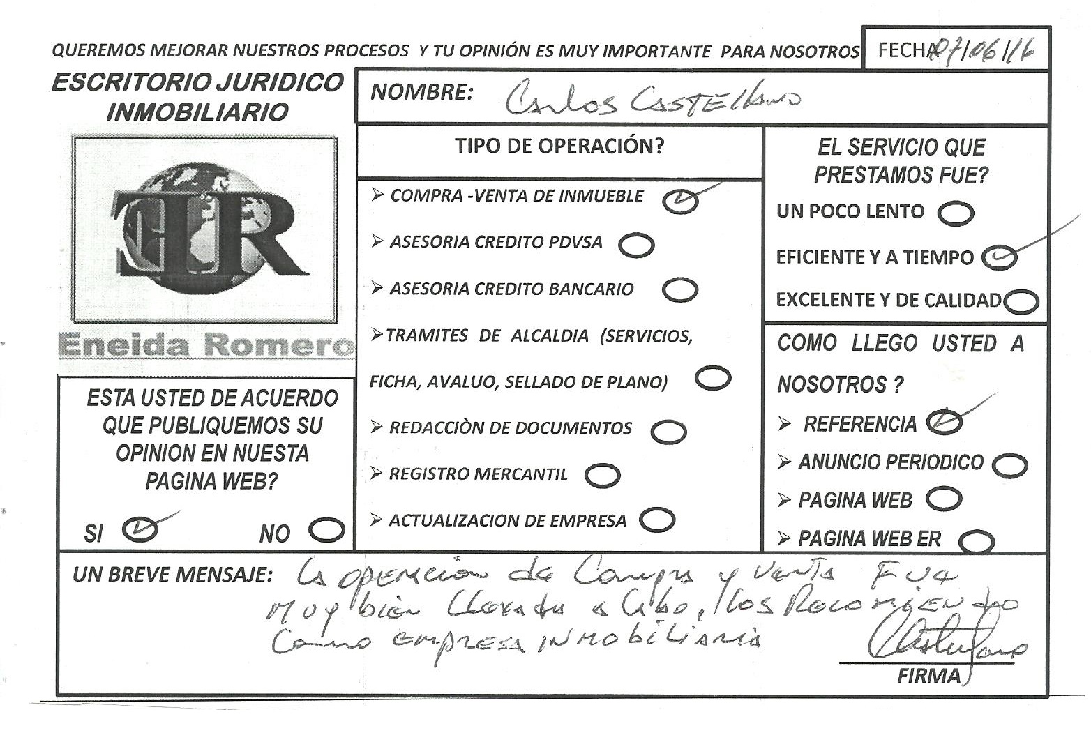 La operación de compra y venta fue muy bien llevada a cabo, los recomiendo como empresa inmobiliaria.